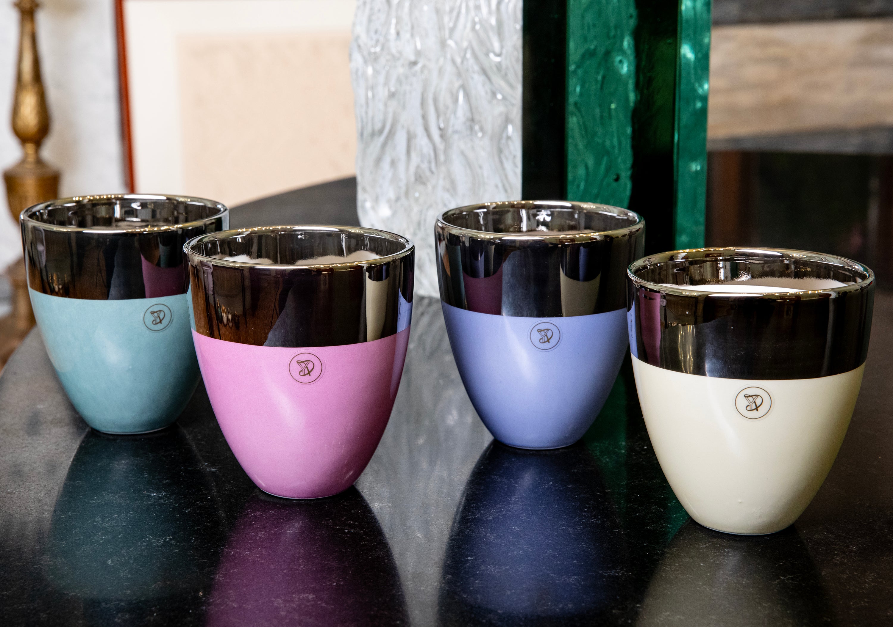Glass set of four made in white clay. Decorated with glaze in two-tone and gold 24k _ platinum _ copper.