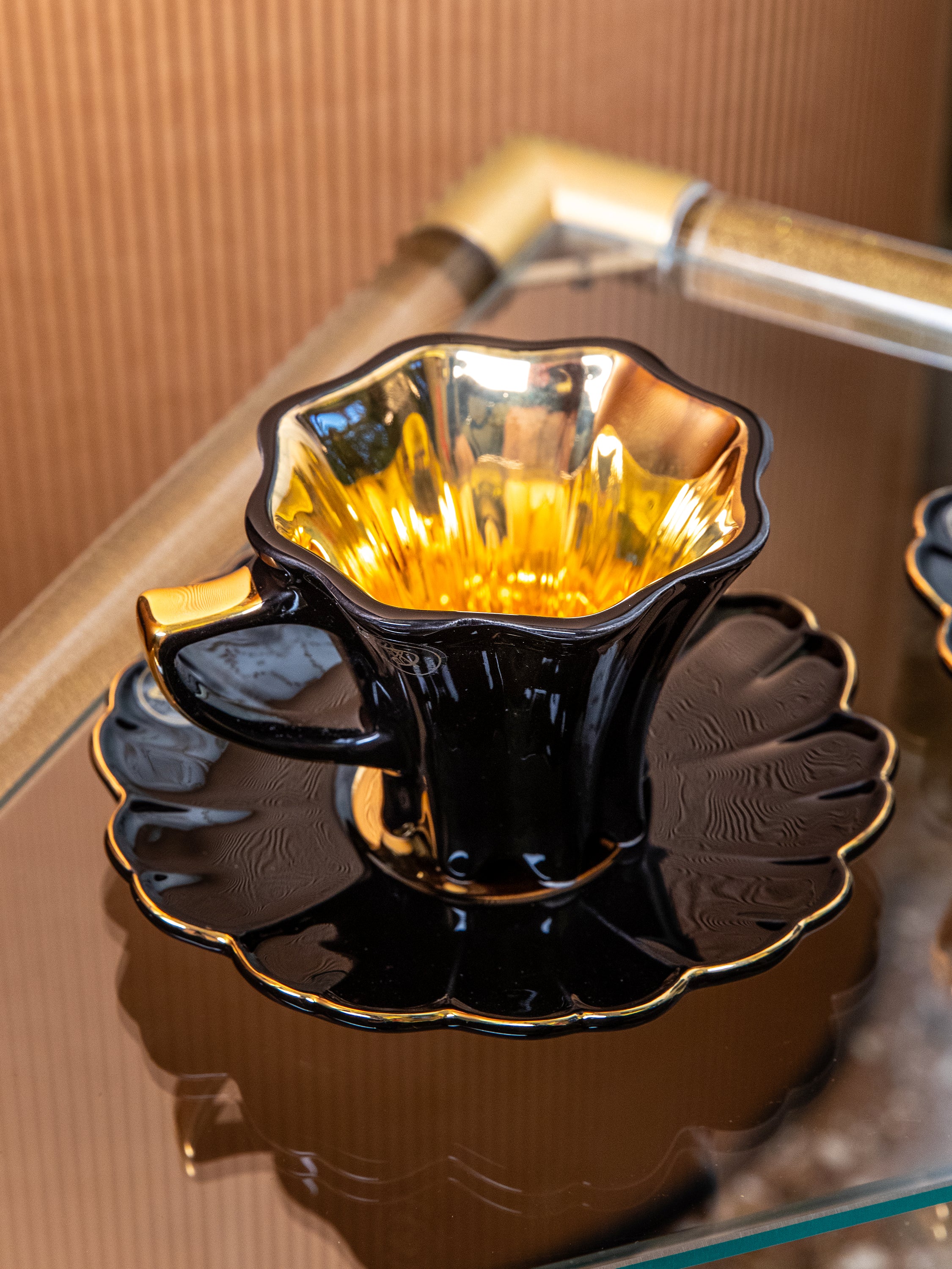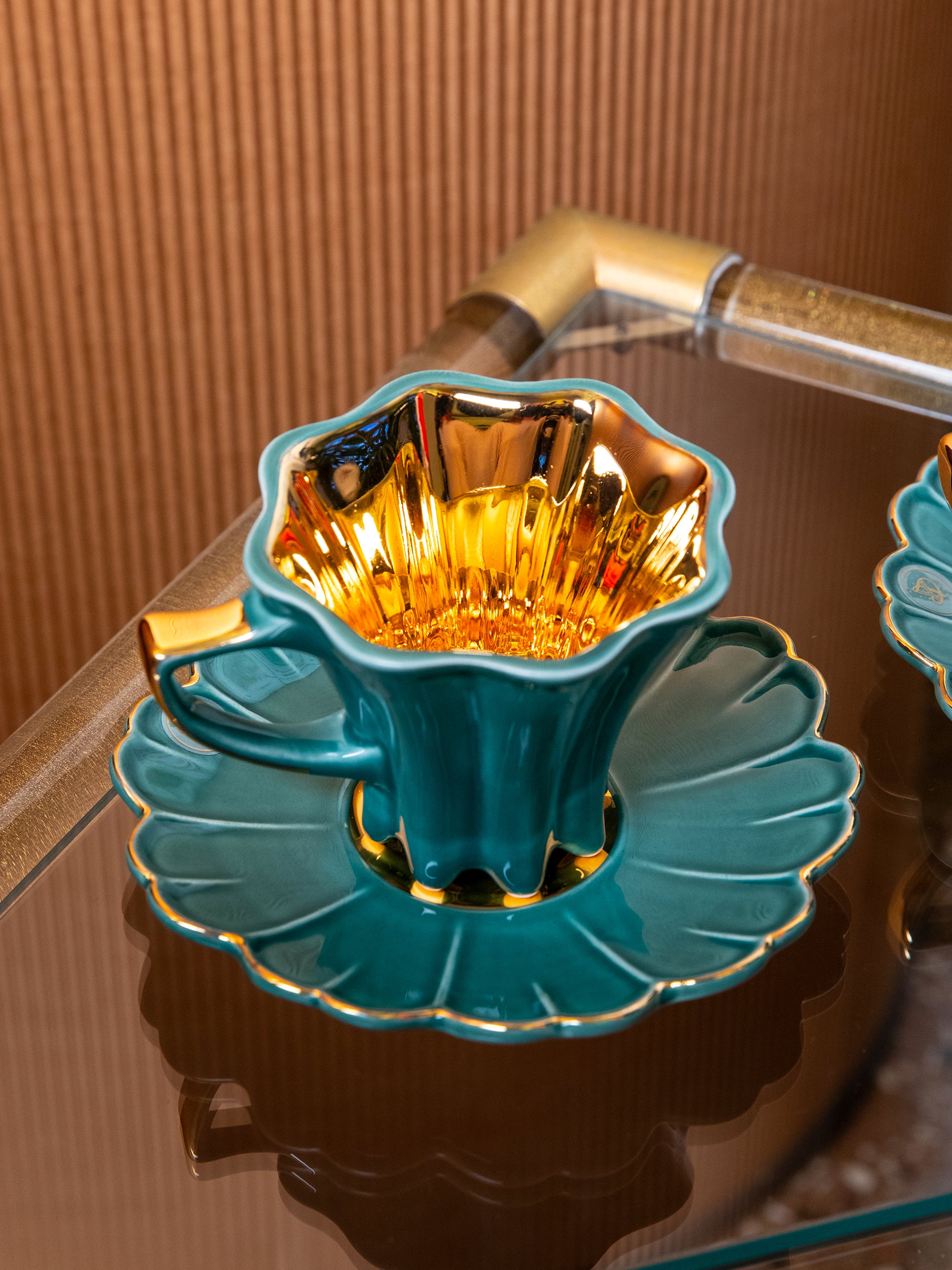 Tea cup and saucer set of two made in white clay. Decorated with glaze in unicolour and gold 24K _ platinum _ copper.